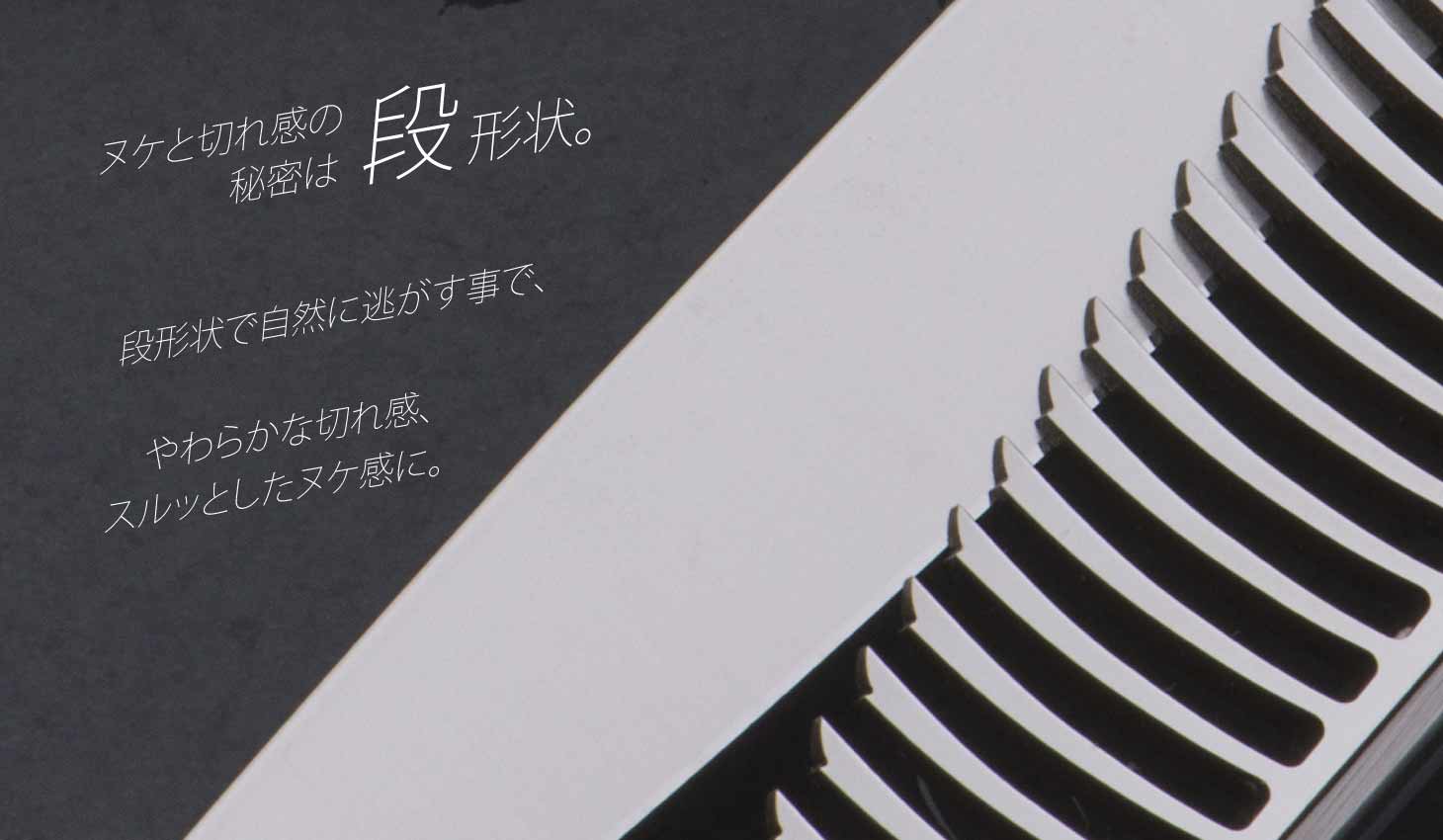 飛燕の段セニングシリーズは、クシ刃1本1本の刃先が階段状になっていて、髪の毛を適度に逃がしながらカットをします。毛を逃がしながら切ることにより、より軽やかに、スムーズにそしてより自然な毛先のばらつき感をだします。