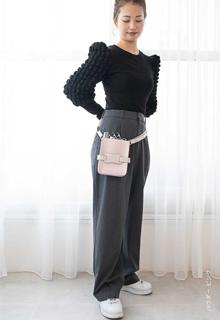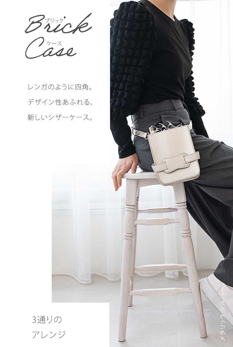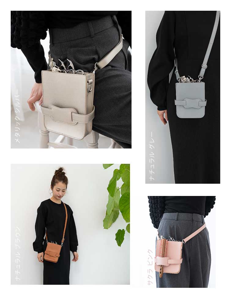 色で散々悩んで結果、シルバーにしてお店で大好評です。意外とどんな服にも合ってハサミケースっぽくなくってとても気に入ってます。その日の気分で肩掛けにも腰巻きにもできるのが素敵です。