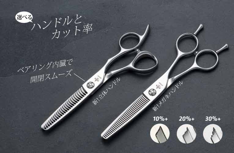 【セニング・刃】スキ率: 10%/20%/30%前後から選べます。切れ感も柔らかくカットラインが出にくいタイプです。